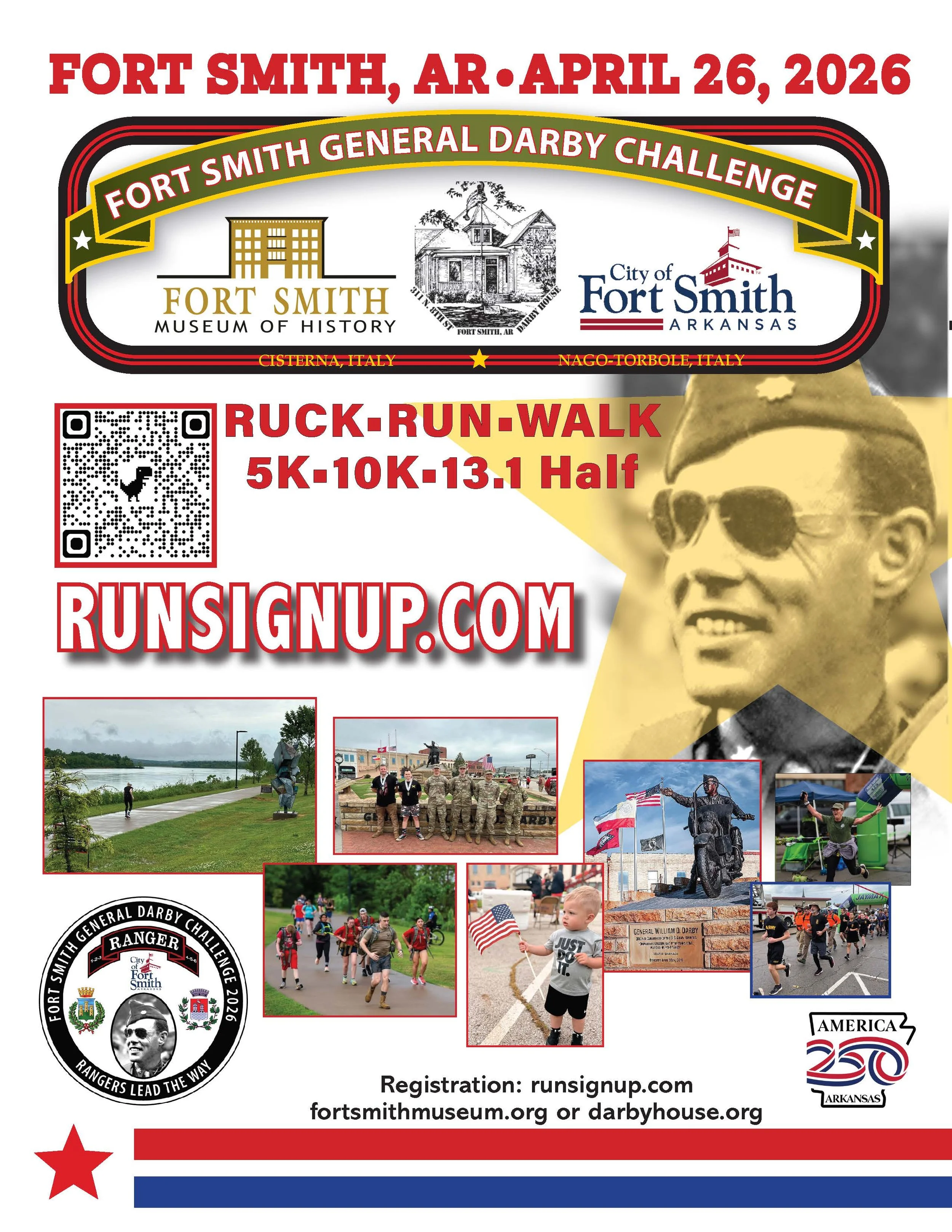 3rd Annual Fort Smith General Darby Challenge, presented by the Fort Smith Museum of History in partnership with The Darby House and the City of Fort Smith. Taking place Sunday, April 26, 2026, at 7:00 a.m. in downtown Fort Smith, this military-inspired ruck march and race honors Fort Smith native General William O. Darby and celebrates the enduring bond between Fort Smith and its Italian sister cities, Cisterna and Nago-Torbole.